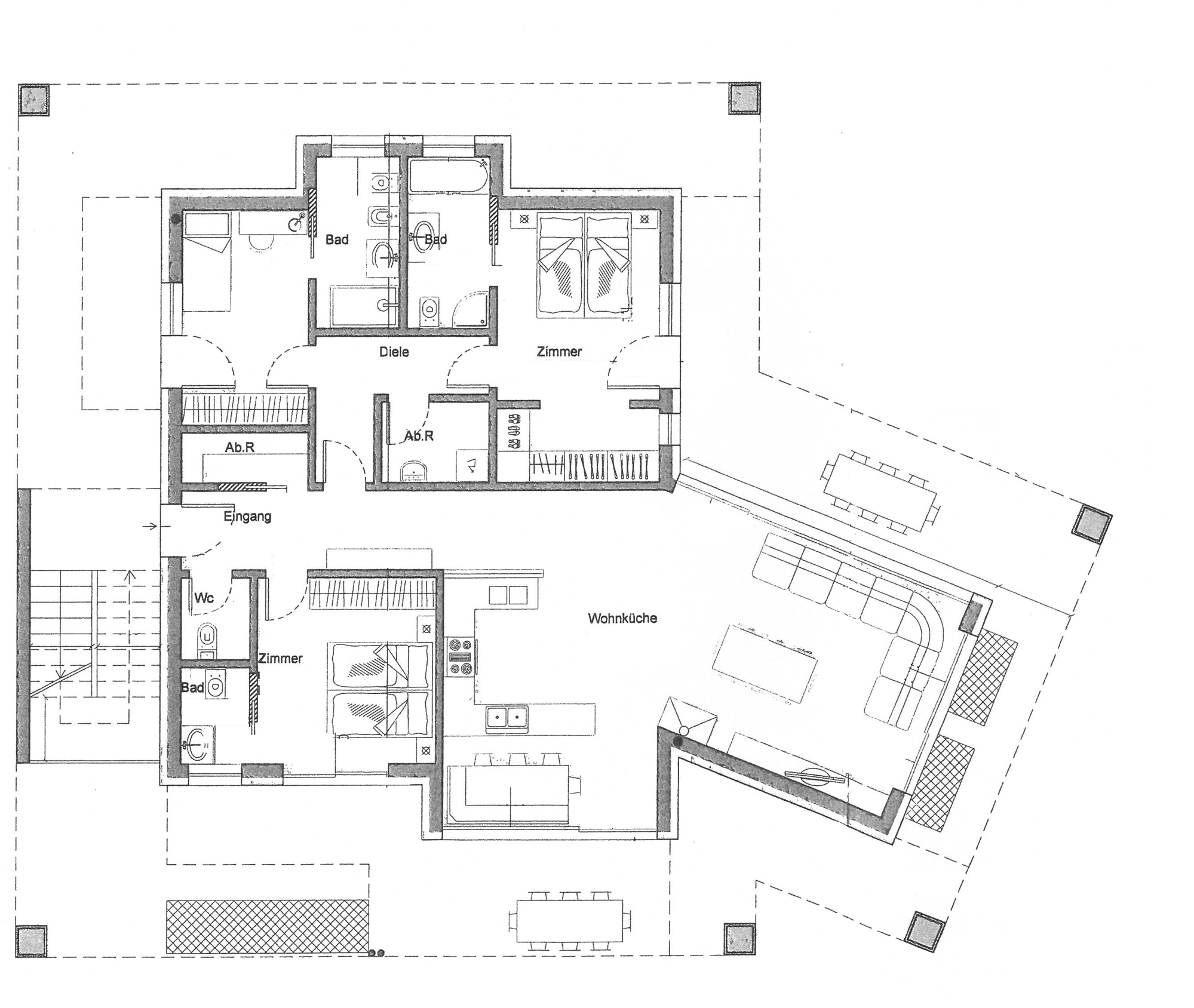 - Obergeschoss: Wohneinheit bestehend aus Eingangsbereich, Wohnküche, Tages-WC, Diele, 2 Abstellräume, 3 Schlafzimmer mit 3 Bädern und Terrassen.
