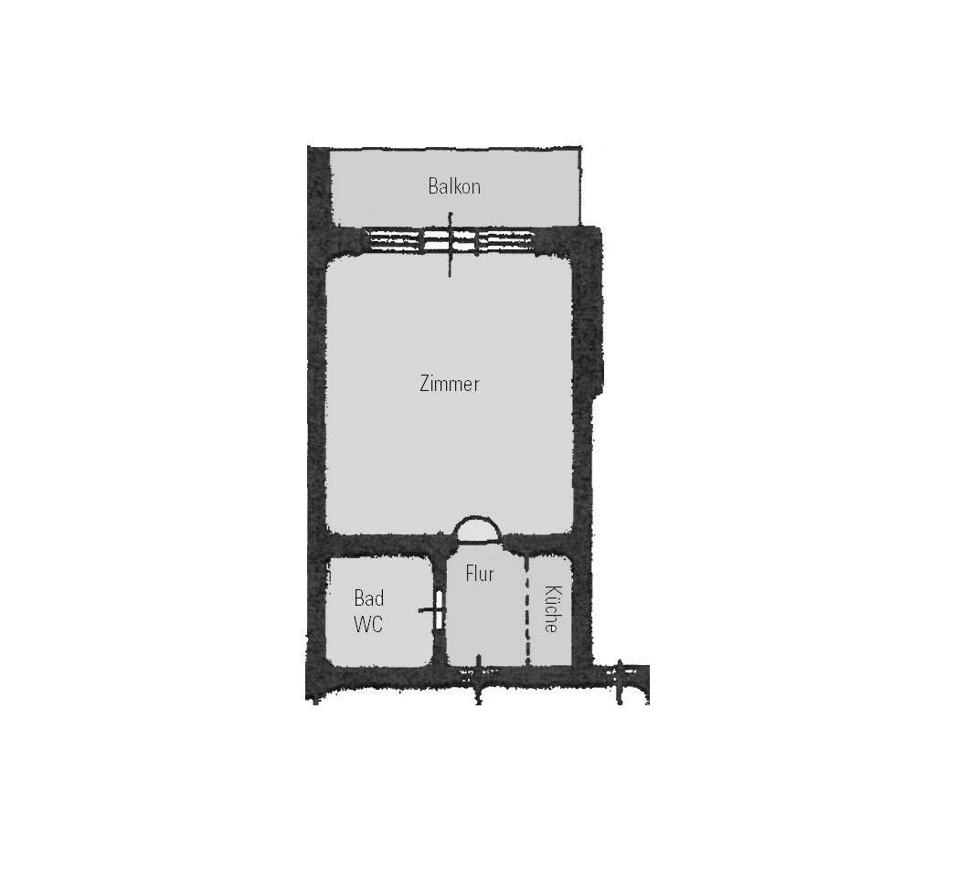 Die Wohnung befindet sich im 1. Obergeschoss eines Mehrfamilienhauses und besteht aus einem großen Wohnraum mit Küchenzeile, sowie einem Badezimmer und einem Balkon. Weiters gehört zur Wohnung ein Kellerabteil im Erdgeschoss.