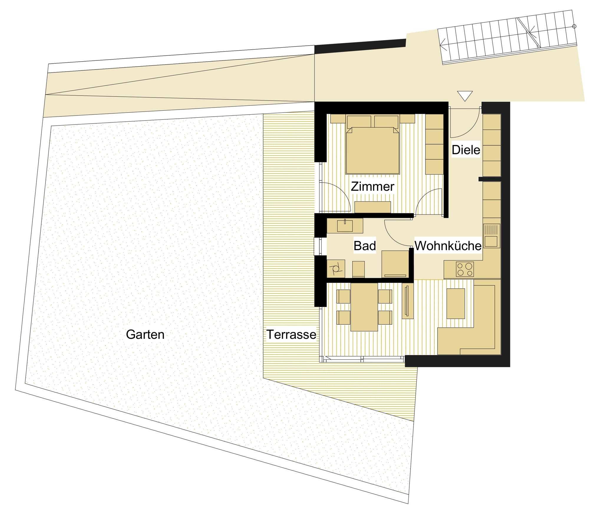 Apartment no. 2 is located on the ground floor of the Residence "Sonnenberg" and consists of a bedroom, bathroom and a kitchen-living room, with a total area of approx. 55.79 m².