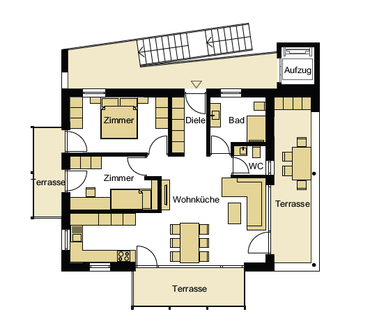 The apartment also has three terraces totaling approx. 19.20 m² and a cellar in the basement.