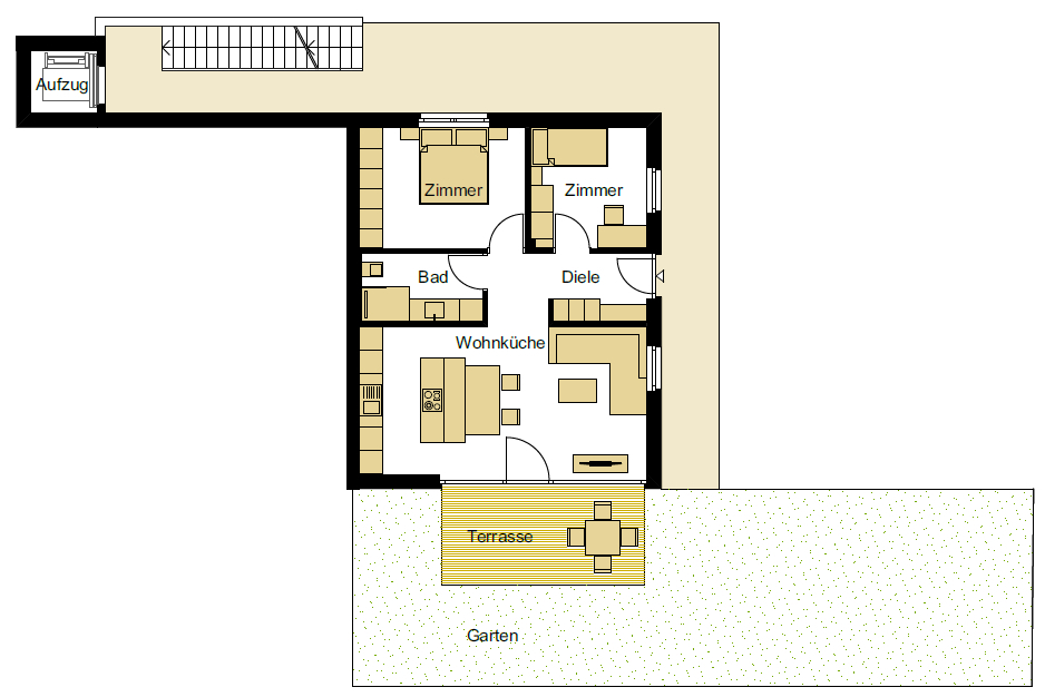 The apartment no. EG1 is located on the first floor of the Residence "Sonnenberg" and consists of 2 bedrooms, a bathroom and a kitchen-living room, with a total area of approx. 78.70 m².