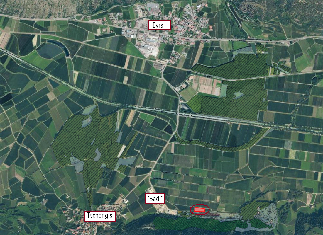 Zum Verkauf steht eine Obstwiese bei Tschengls, einer Fraktion der Gemeinde Laas. Die Liegenschaft befindet sich in der Nähe der Industriezone "Badl" und hat eine Fläche von 3.031 m². Das Grundstück ist mit Apfelbäumen der Sorte Gala bepflanzt und verfügt über eine Tropf- und eine Frostberegnung.
