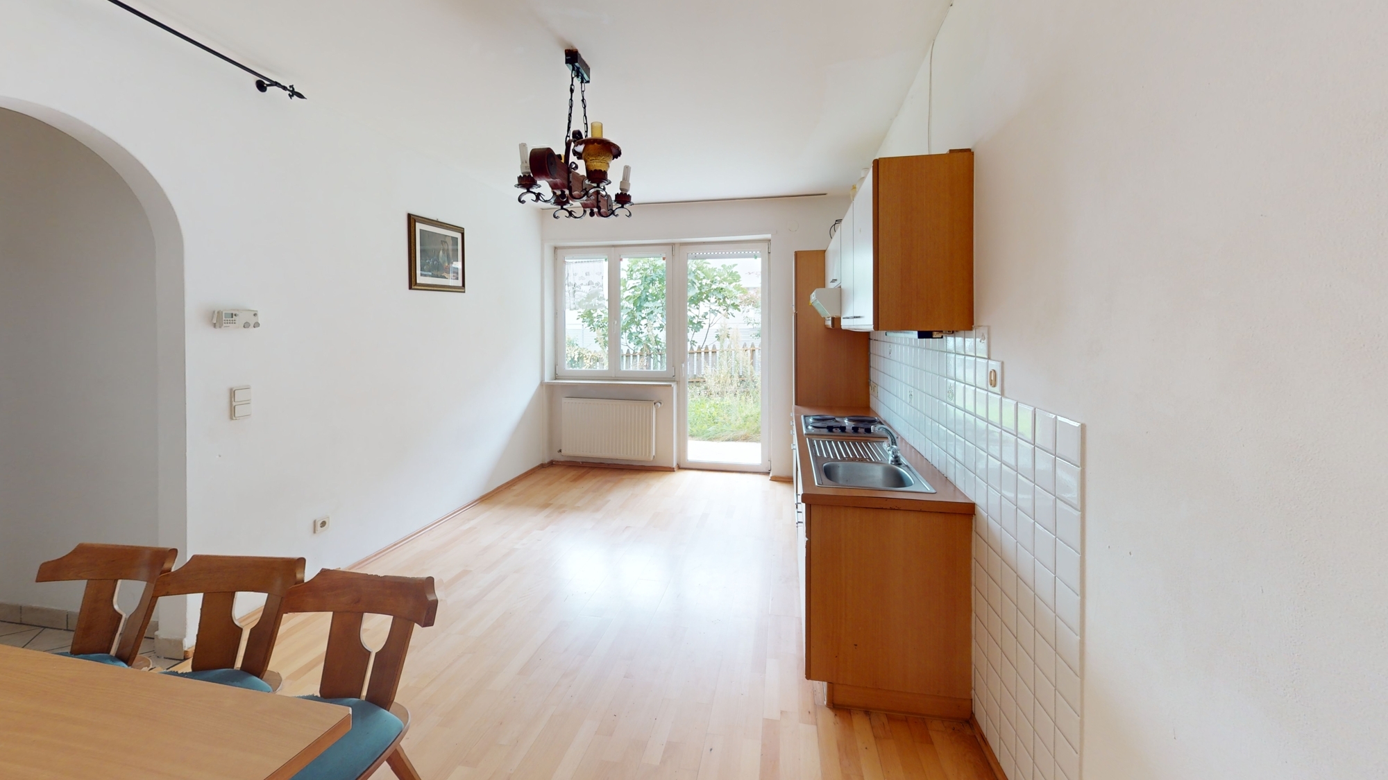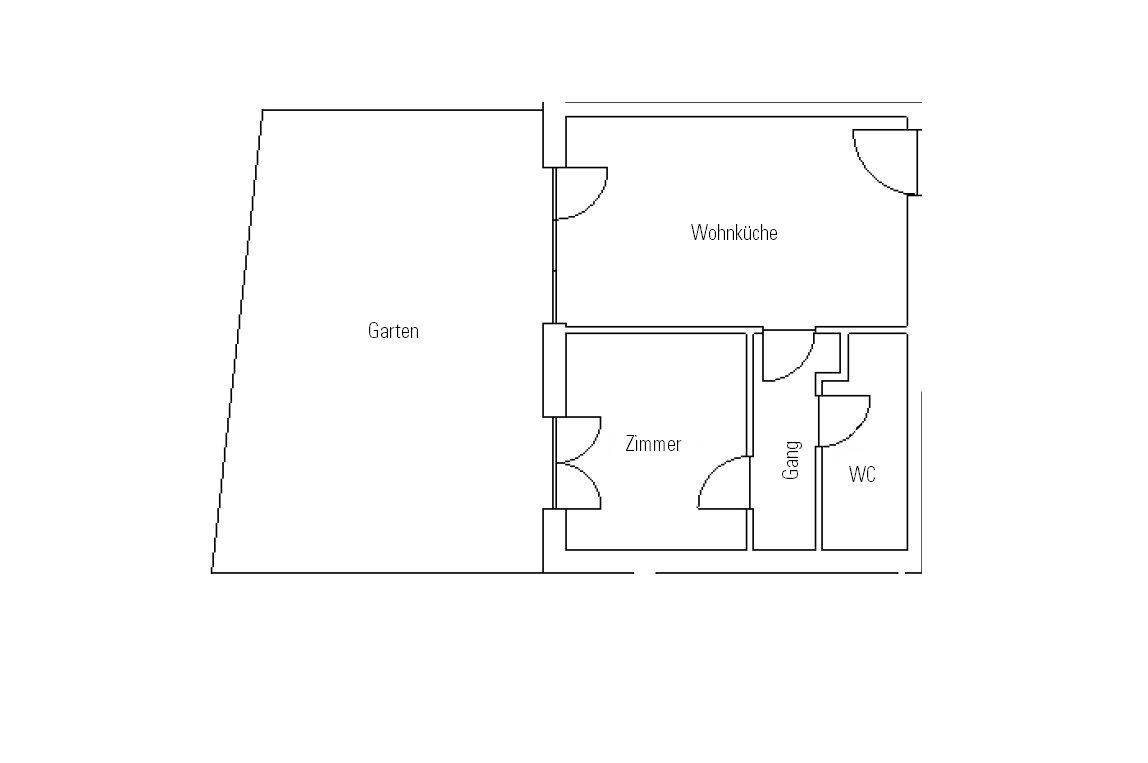 Die Wohnung befindet sich im Erdgeschoss eines Mehrfamilienhauses mit insgesamt 7 Wohneinheiten und besteht aus Wohnküche, Schlafzimmer, Badezimmer, Gang und einer kleinen Terrasse mit Garten.