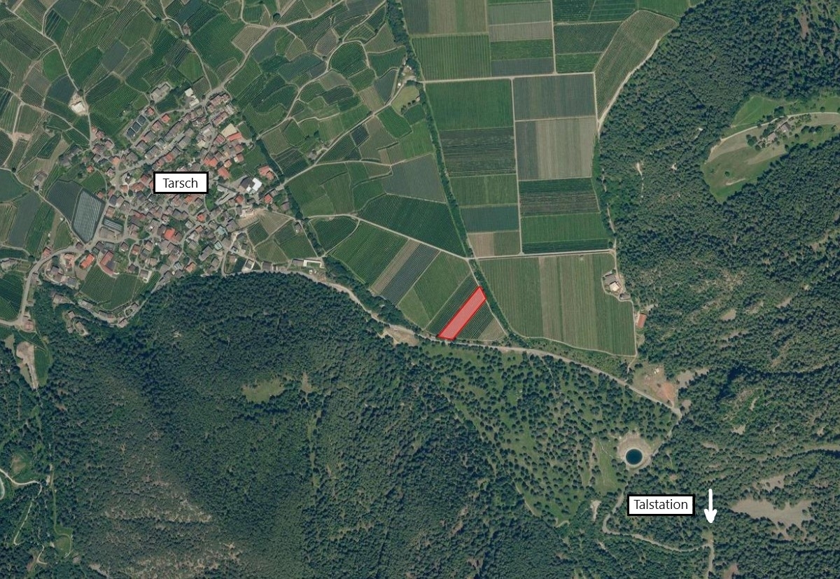 Das Grundstück befindet sich etwas oberhalb des Dorfes, an der Straße Richtung Talstation Tarscher Alm.