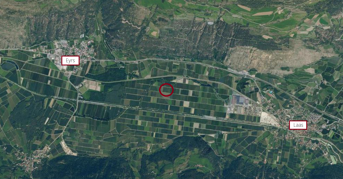 Zum Verkauf steht eine Obstwiese in den Laaser Mösern. Die Liegenschaft hat eine Fläche von 11.319 m² und ist derzeit mit Apfelbäumen der Sorte Golden Delicious bepflanzt.