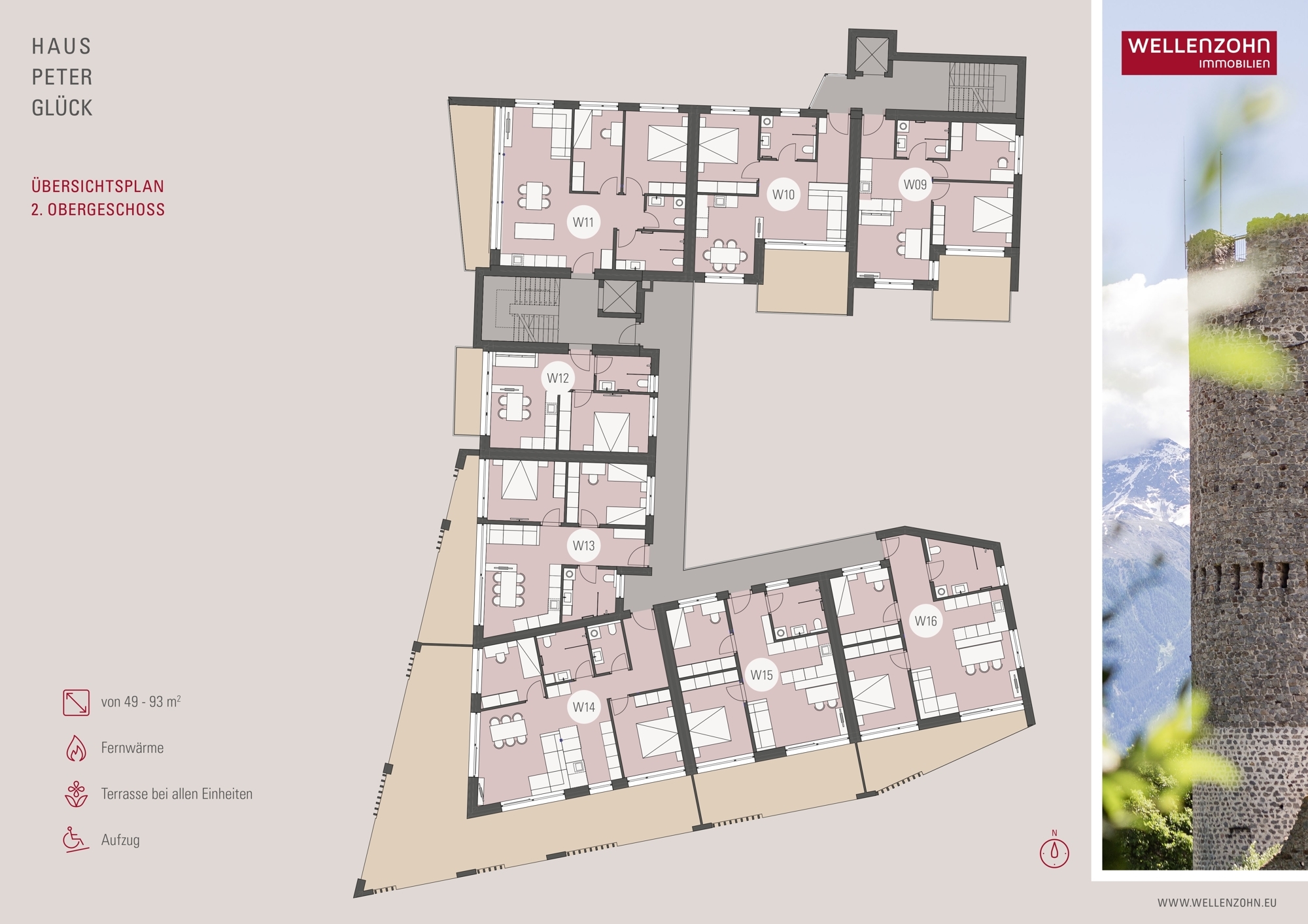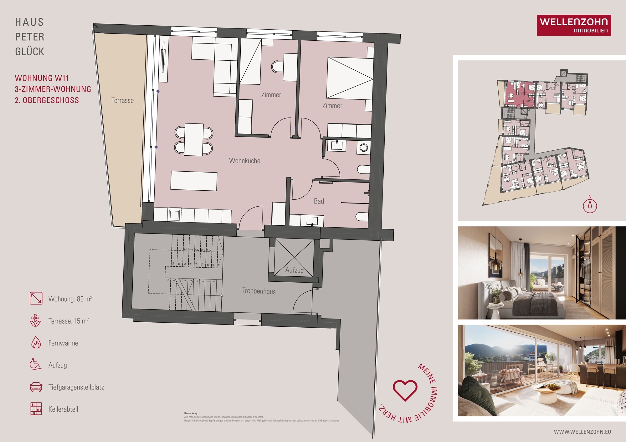 Die Wohnung Nr. 11 befindet sich im 2. Obergeschoss der Wohnanlage und hat eine Wohnfläche von ca. 89 m². Sie ist wie folgt aufgeteilt: Wohnküche, 2 Schlafzimmer, Tages-WC und Badezimmer. Außerdem gehört zur Wohnung eine Terrasse mit ca. 15 m².