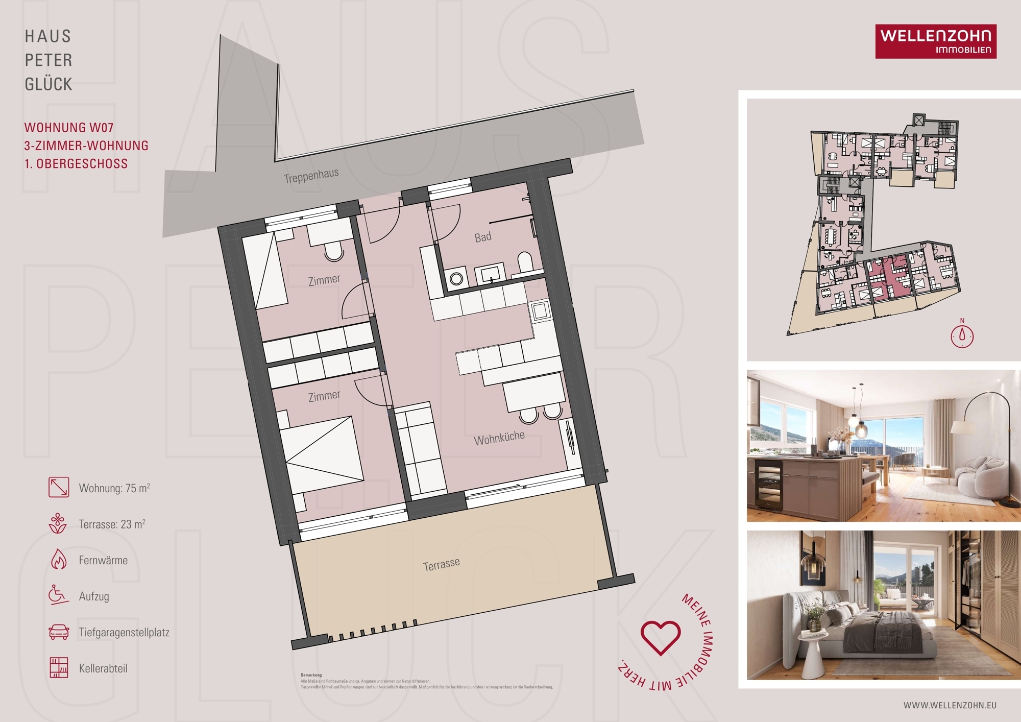 Die Wohnung Nr. 7 befindet sich im 1. Obergeschoss der Wohnanlage und besteht aus Wohnküche, Badezimmer und 2 Schlafzimmer. Zur Wohnung gehört außerdem eine Terrasse mit einer Fläche von ca. 23 m².