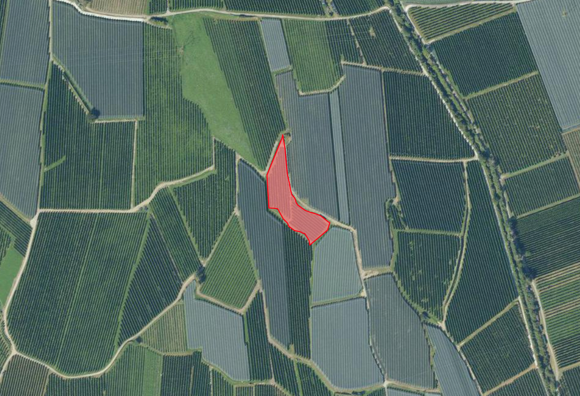 Die Liegenschaft hat eine Katasterfläche von 3.863 m² und ist mit Apfelbäumen der Sorte Golden Delicious bepflanzt.