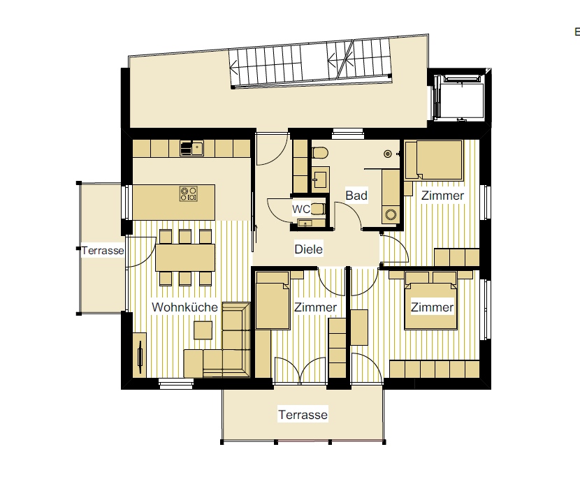 Weiters gehören zur Wohnung zwei Terrassen mit ca. 14,80 m² und ein Keller im Untergeschoss.