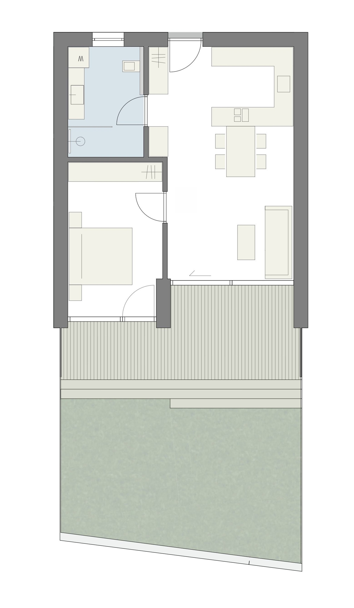 Die Wohnung Nr. 5 befindet sich im Erdgeschoss und hat eine Wohnfläche von ca. 67 m². Sie ist wie folgt eingeteilt: Schlafzimmer, Badezimmer und eine geräumige Wohnküche.