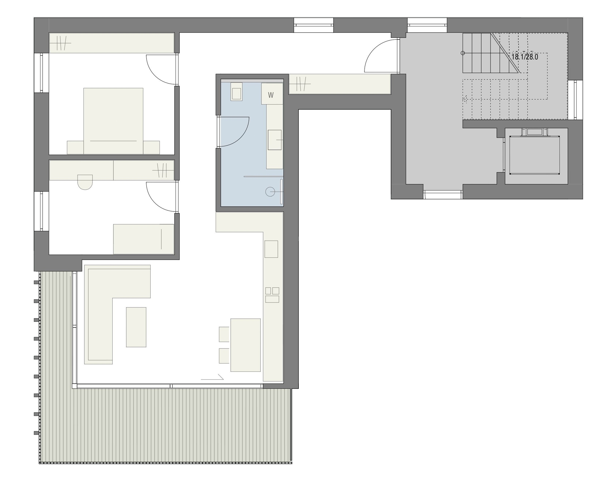 Die Wohnung Nr. 14 befindet sich im 2. Obergeschoss und hat eine Wohnfläche von ca. 94 m². Sie ist wie folgt eingeteilt: Diele, 2 Schlafzimmer, Badezimmer und Wohnküche.