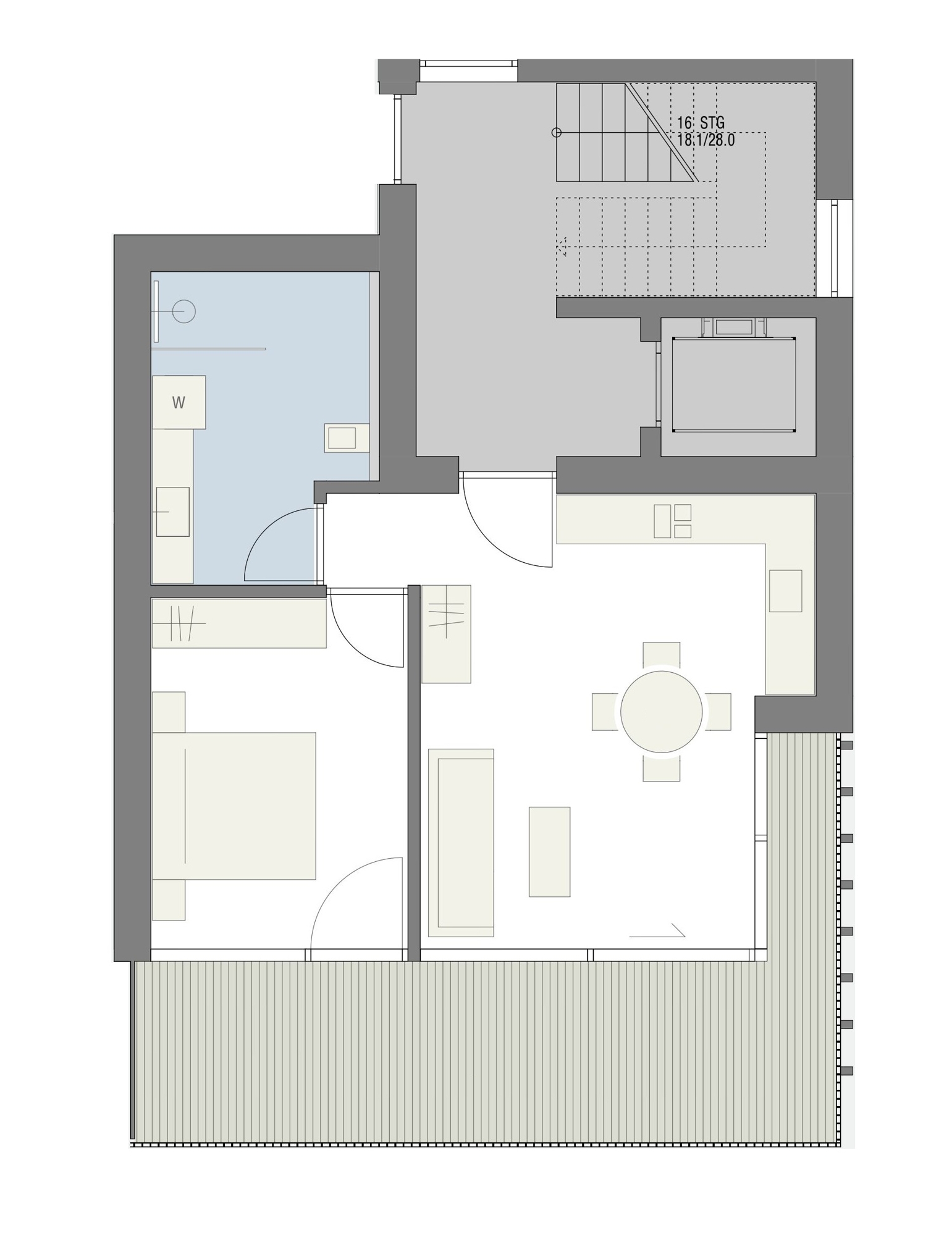 Außerdem gehören zur Wohnung eine Terrasse mit ca. 22 m² und ein Keller im Untergeschoss.