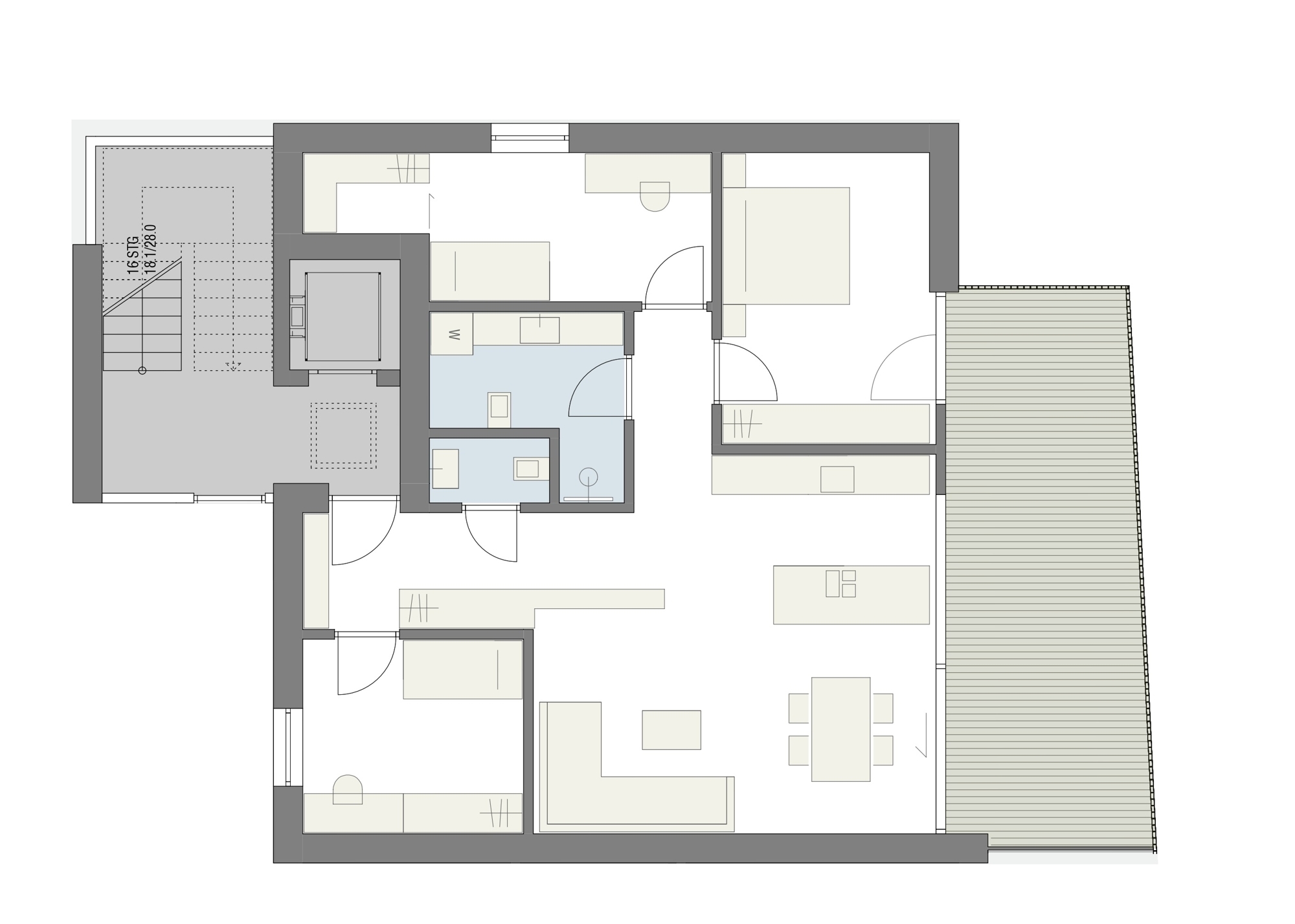 Die Wohnung Nr. 16 befindet sich im 2. Obergeschoss und hat eine Wohnfläche von ca. 109 m². Sie ist wie folgt eingeteilt: Diele, 3 Schlafzimmer, Badezimmer und Tages-WC, sowie eine Wohnküche.