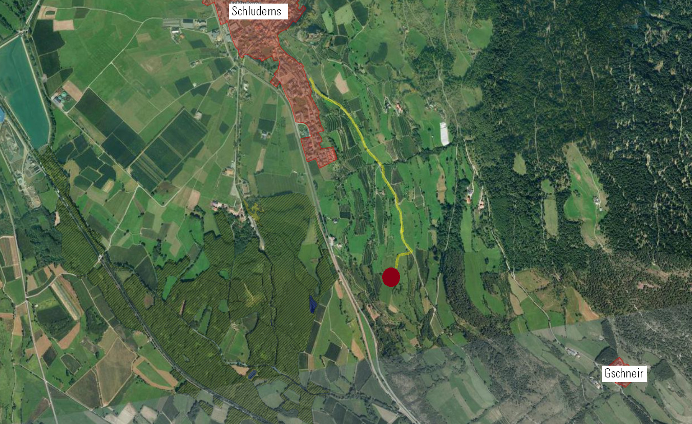 Das Grundstück befindet sich am Sonnenhang von Schluderns in der Nähe der Verbindungsstrasse zwischen Schluderns und Tanas.