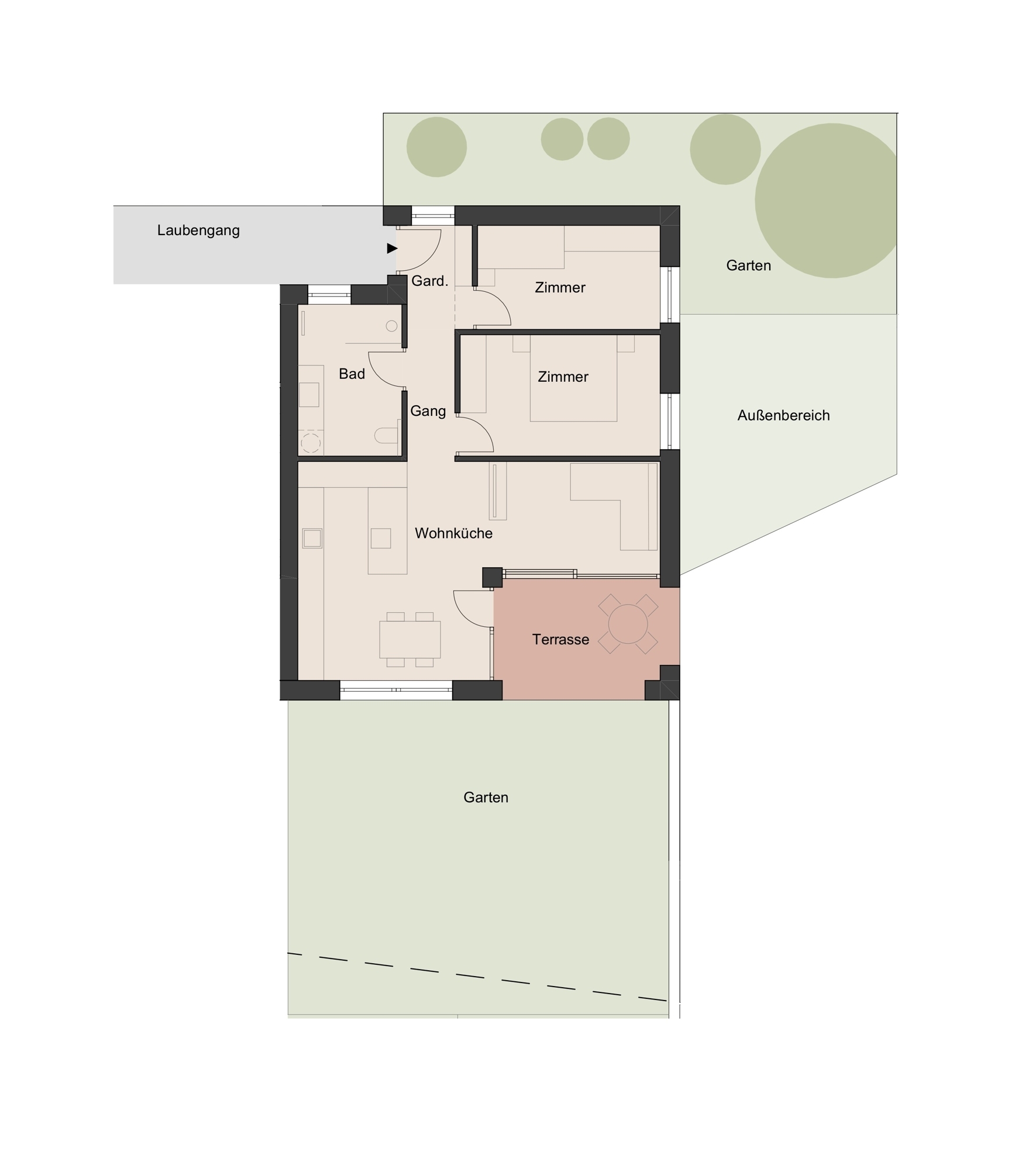 Weiters gehört zur Wohnung eine Terrasse mit ca. 11 m², ein Garten mit ca. 126 m² und ein Keller im Untergeschoss.