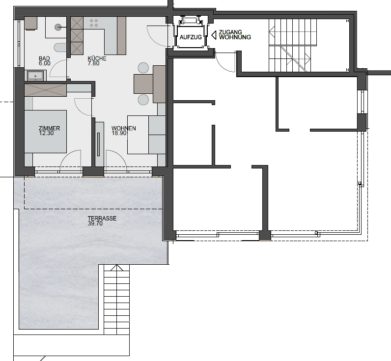Die Wohnung befindet sich im Erdgeschoss des Chalet "Ortler" und verfügt über ein Schlafzimmer, eine Wohnküche, ein Badezimmer und eine großzügige Terrasse.