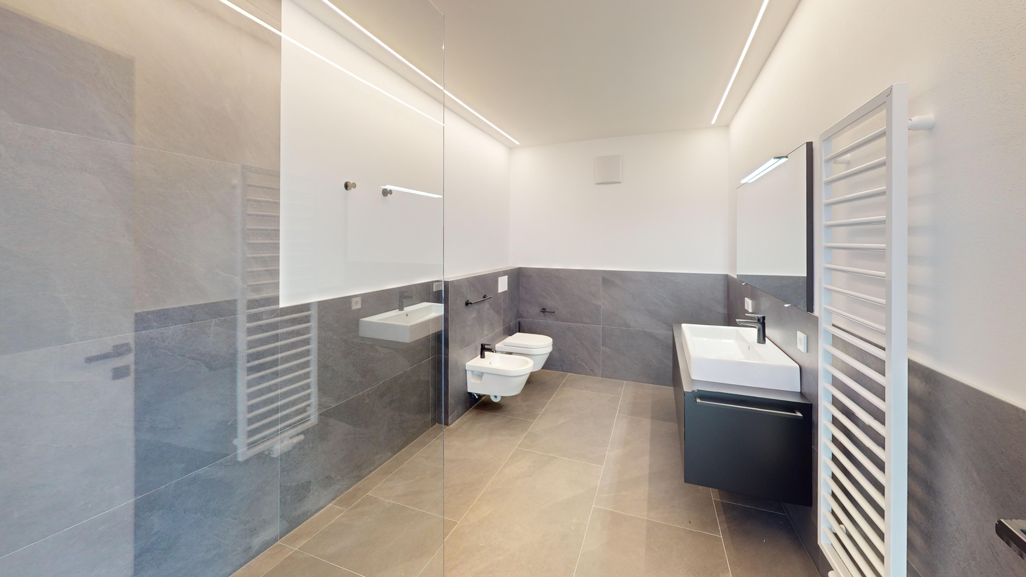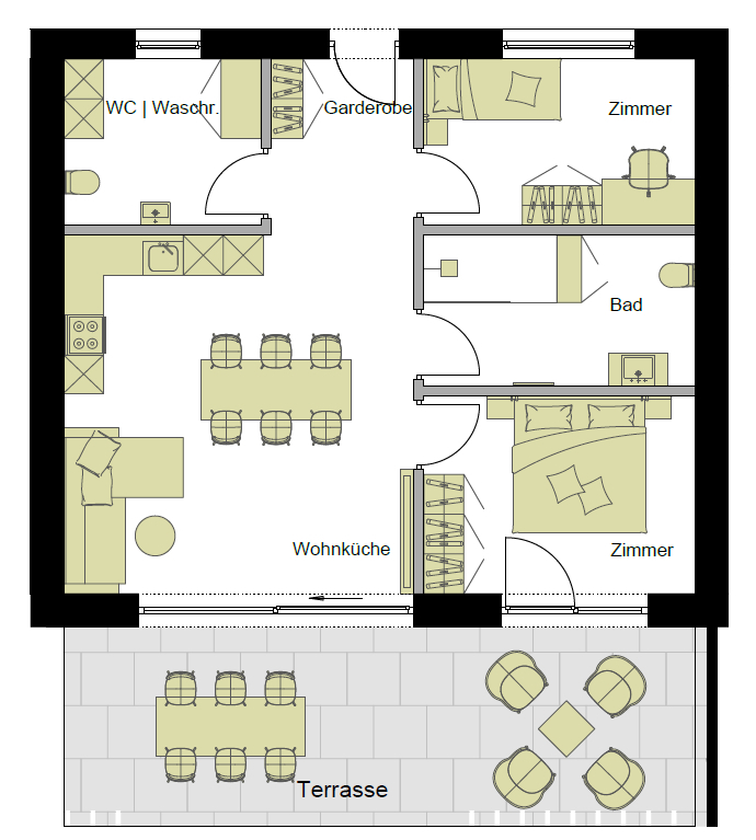 Der Wärmeaustausch in der Wohnung erfolgt mittels Fußbodenheizung.