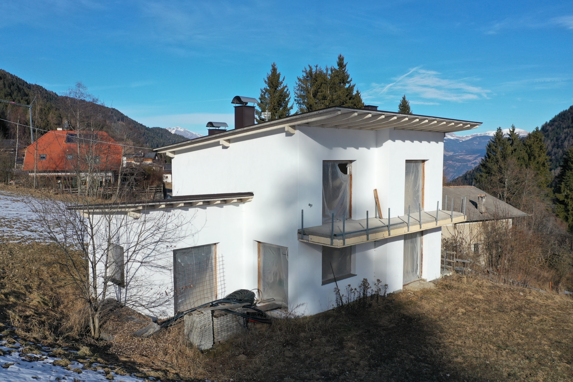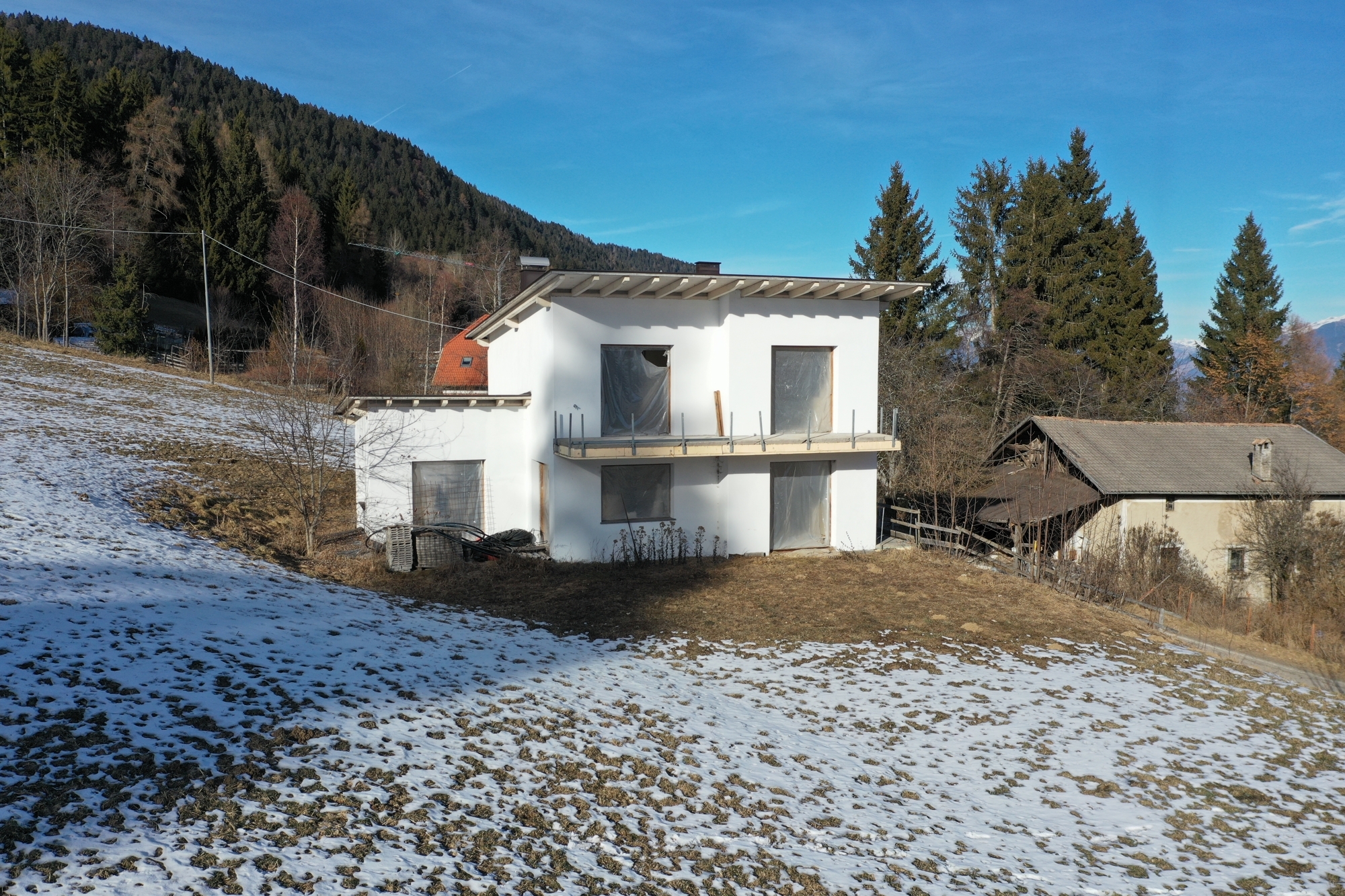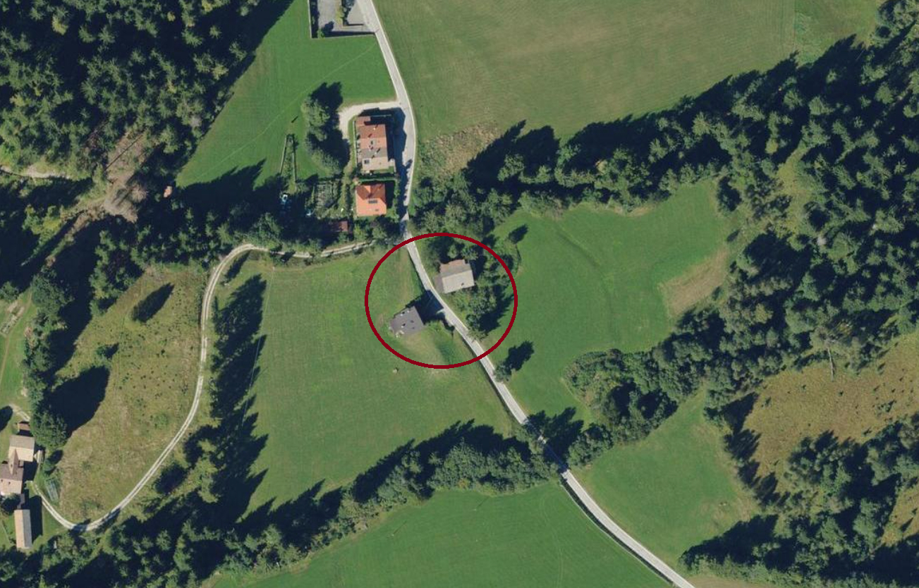 - Neue Hofstelle mit Wohnhaus vor Fertigstellung und zusätzlichem Bauvolumen auf der Gp. 1525. Das Wohnhaus ist wie folgt eingeteilt: Untergeschoss mit Garage, Erdgeschoss und 1. Obergeschoss