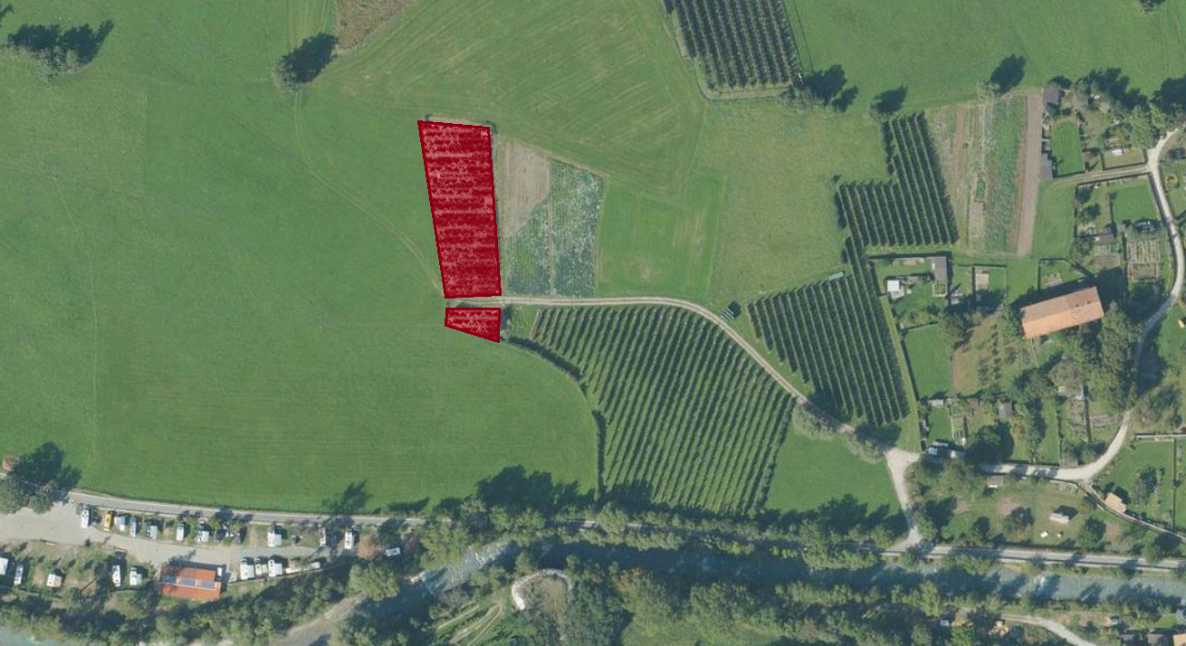 Das Grundstück hat eine Katasterfläche von 1.629 m² und ist mit Apfelbäumen der Sorte "Ambrosia" bepflanzt.