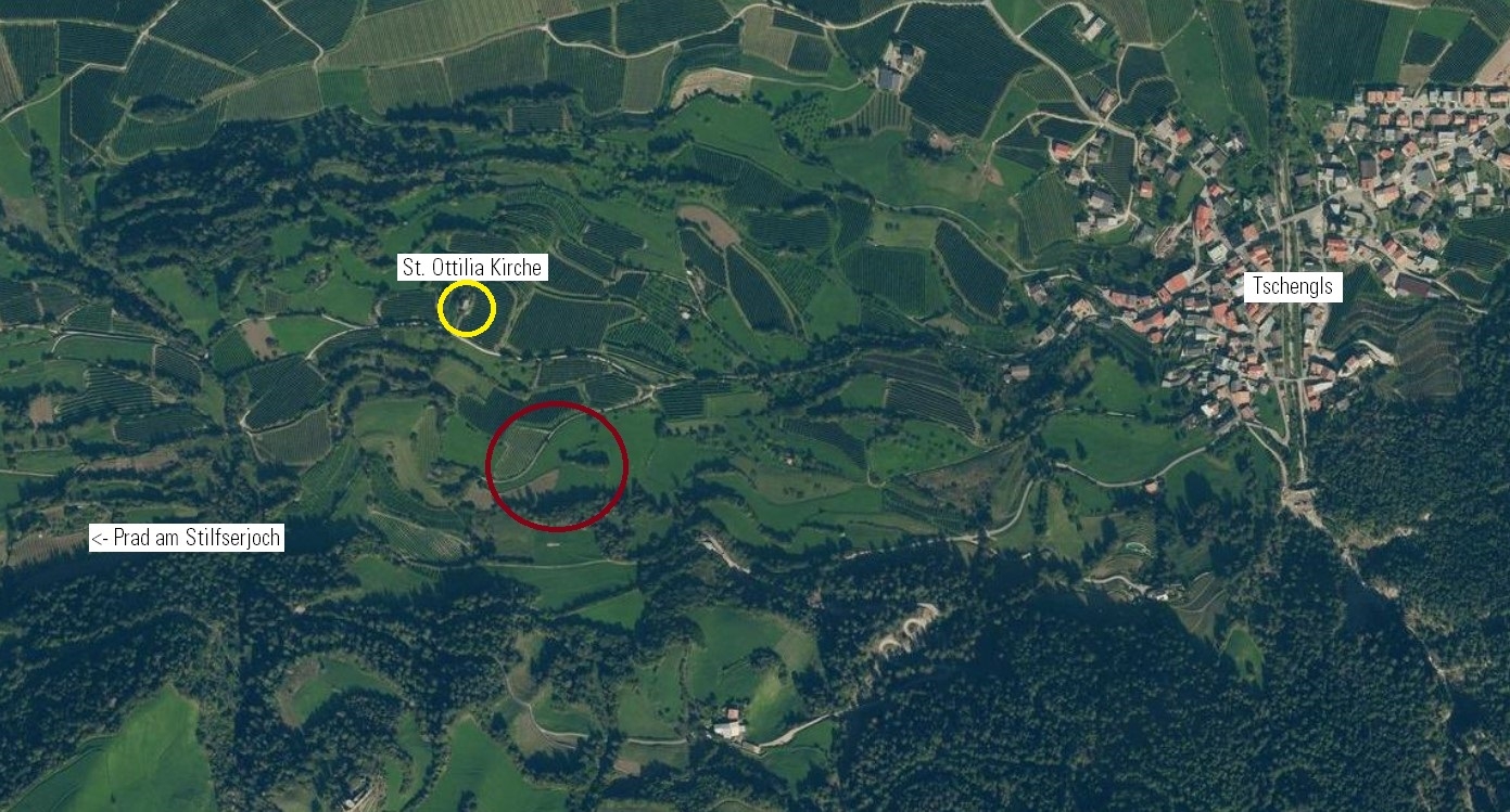 Zum Verkauf steht ein landwirtschaftliches Grundstück, oberhalb der St. Ottilia Kirche bei Tschengls, einer Fraktion der Gemeinde Laas.