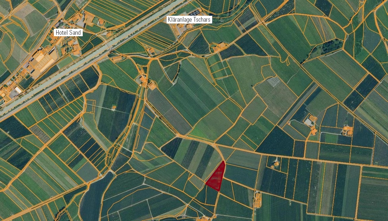 Zum Verkauf steht eine Obstwiese in Tschars. Die Liegenschaft hat eine Katasterfläche von ca. 4.535 m² und ist derzeit mit Apfelbäumen der Sorte Gala bepflanzt.